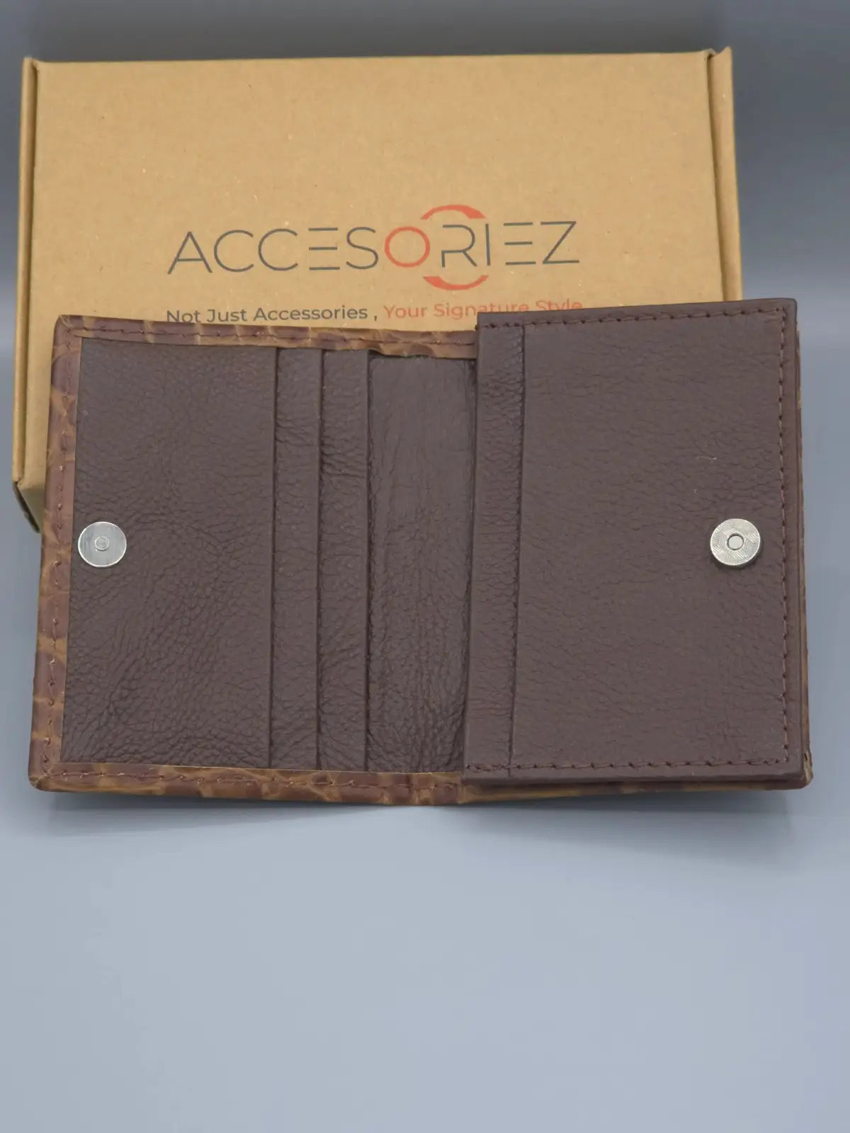 What makes this wallet unique? The standout feature is the Golden Croco Texture, which provides a rich and royal appearance. Inside, you will find a Secure Magnetic Snap Button to ensure your belongings stay perfectly safe. Along with this security, it offers multiple card slots and a spacious main compartment that fits all your essentials while remaining compact. Its rich brown shade matches perfectly with any outfit.